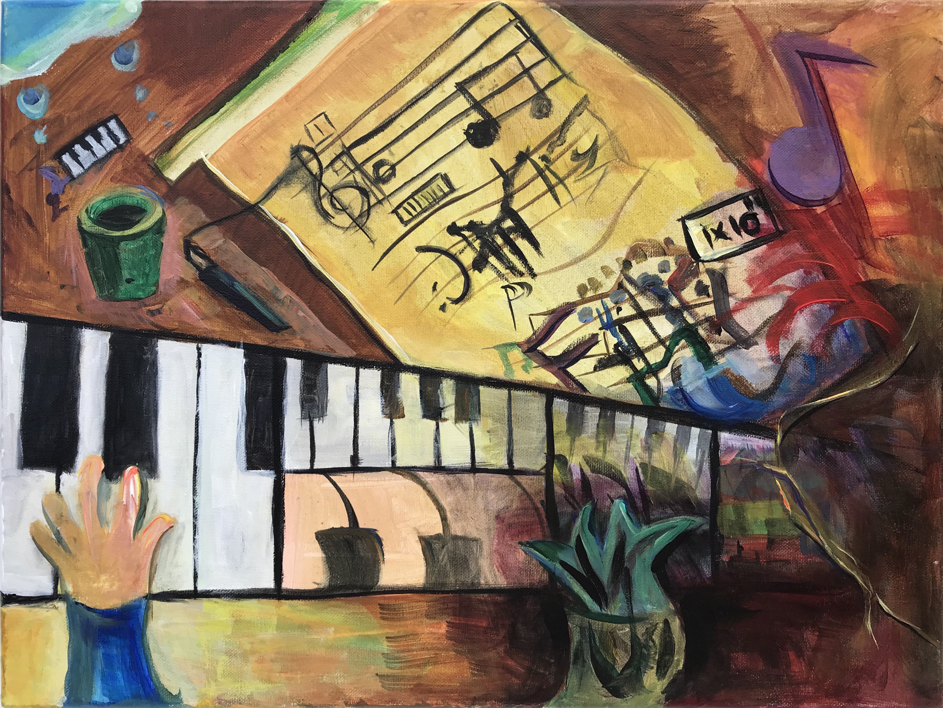 The first painting of my career exemplified the traits my art would be known for: vibrant colors, imagination, and music. We start with a normal piano and sheet music, but then the composer turns wild and orders an impossible set of notes; as a result, the pianist is forced to adapt, distorting and morphing the piano and growing alien hands. Eventually, the pressure from the wildness bursts open at the seams, destroying the music and the piano, while a single purple note, flying up out of the abyss, escapes.