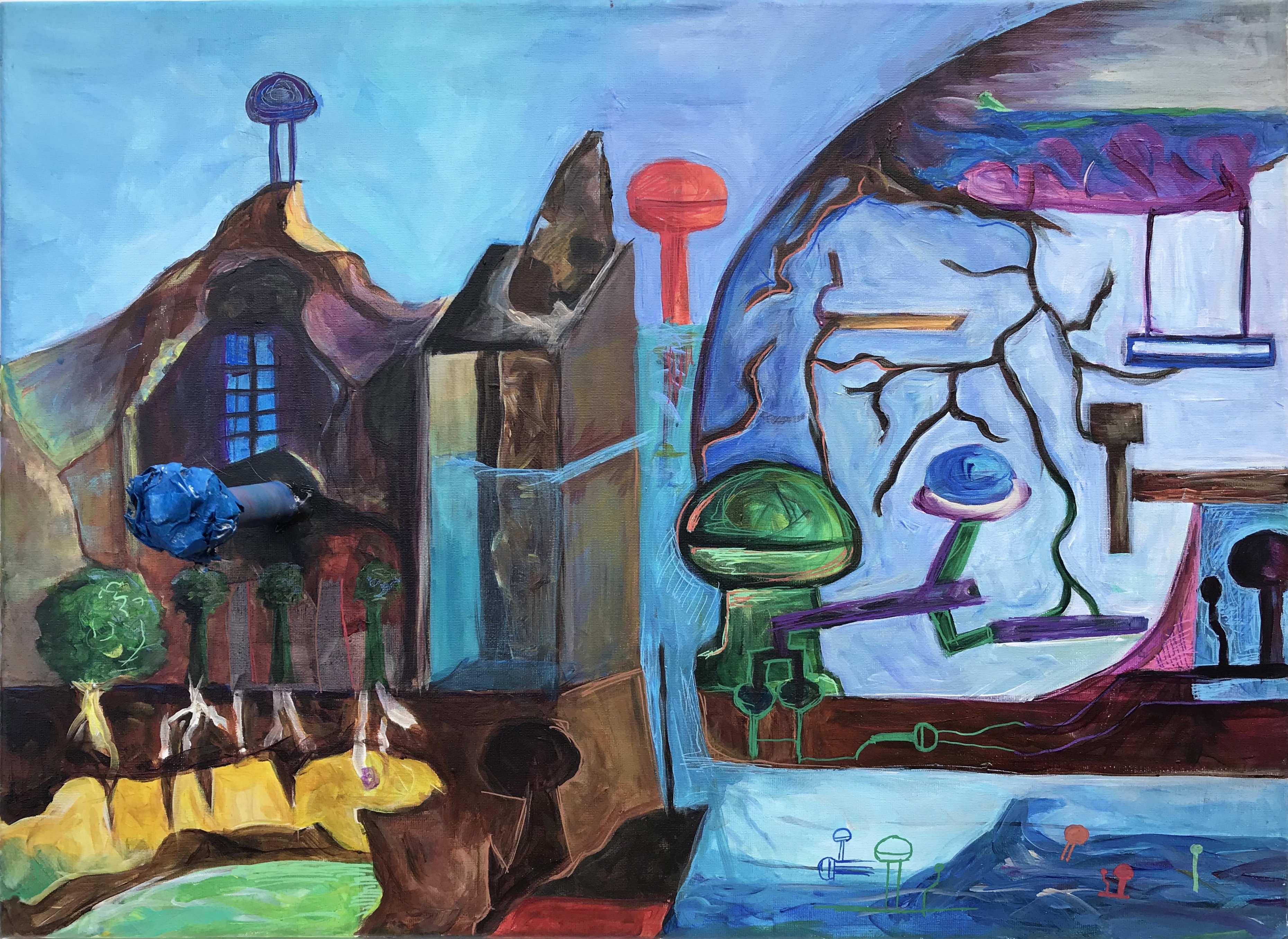 Variations on the famous Van de Graaff machine. The right side is a planetarium, the left a castle carved into the mountain, which contains a 3D blue Van de Graaff extending outwards. The water of a large tank on the right of the mountain flows out its side and under the planetarium. Below the mountain lies a cave, shaped like a dinosaur; this is inspired by the shape of large realm separating many levels of the game VVVVVV. Part of the cave is seceding to become a ship, which wants to brave the waters leading out of the painting.