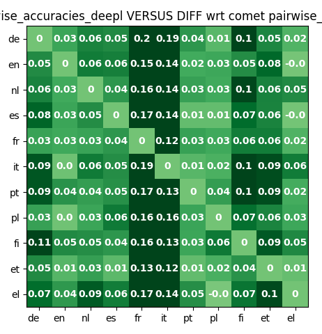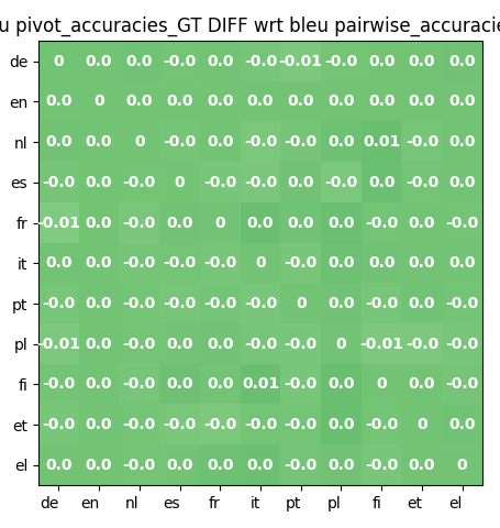 Here are sample illustrative plots. The "from language" is the row (see left-side language labels); the "to language" is the column (see bottom language labels). For example, in the NIST DeepL Pairwise Accuracy graph, translations from Portuguese (PT) to Greek (EL) have accuracy 2.62, while translations from EL to PT have accuracy 2.59. To see all 72 plots, visit our code (coming soon).