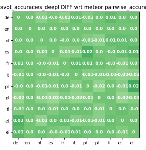 METEOR DeepL Pivot vs Pairwise Accuracy Differential. Improvements are negligible, if any; the difference is not statistically significant.