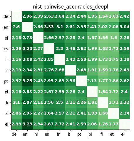 NIST DeepL Pairwise Translation Accuracy. Note how English distinctly outperforms other languages!